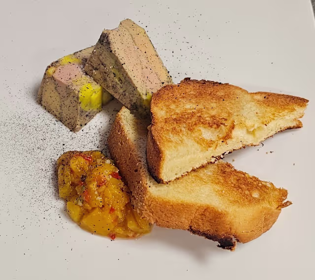 - foie gras parfumé au vieux rhum servi avec un chutney de mangue et une brioche toaste