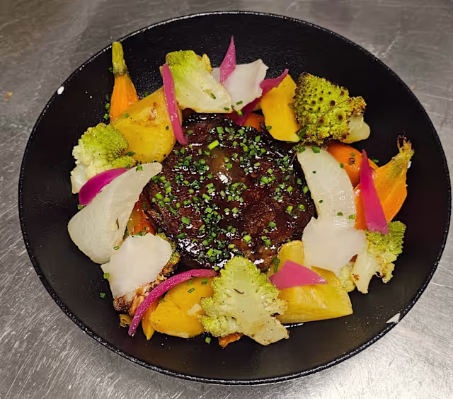 - Paleron de boeuf braisé mijoté au vin rouge avec des petis légumes d'hiver façon pot au feu