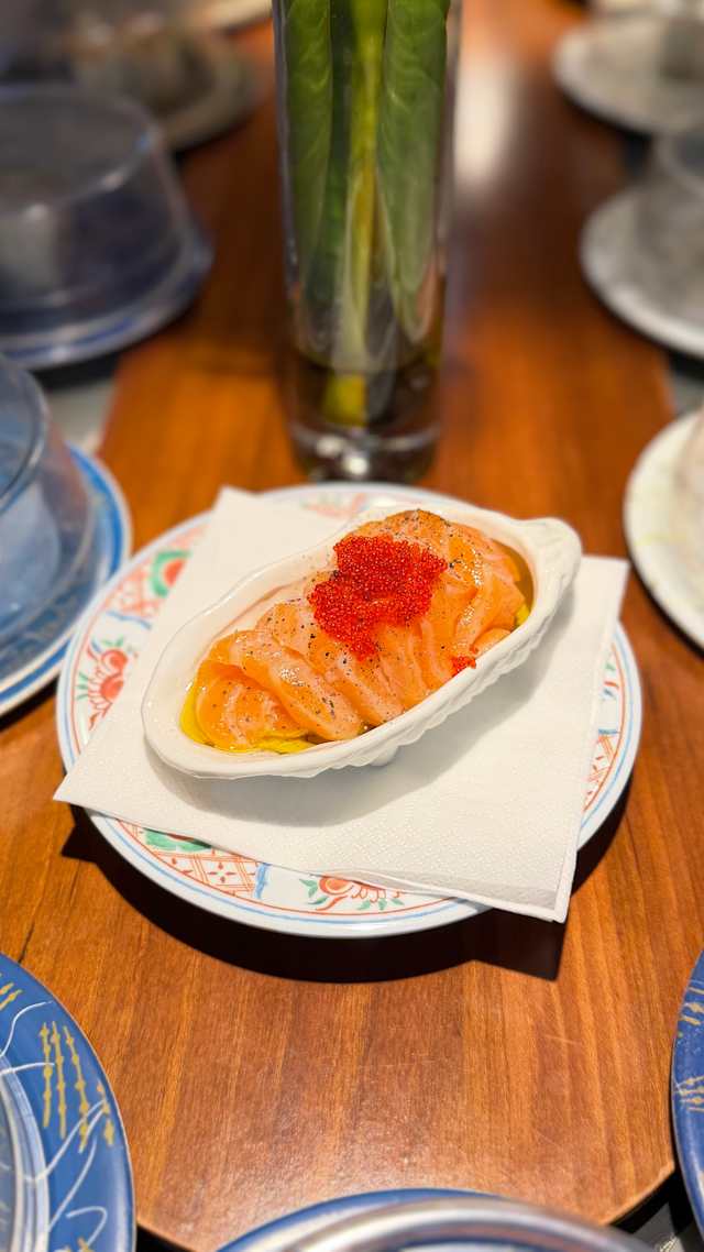 - Salmon, salmon tartare, spicy sauce, spring onion