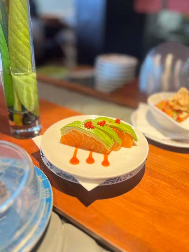 - Fried shrimp, salmon, cream cheese, spring onion, teriyaki sauce