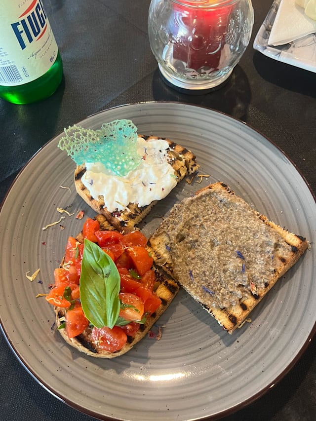 Tris di bruschette :crudo con stracciatella - pomodorini e basilico - crema di porcini e speck