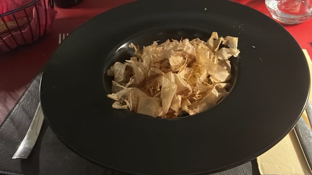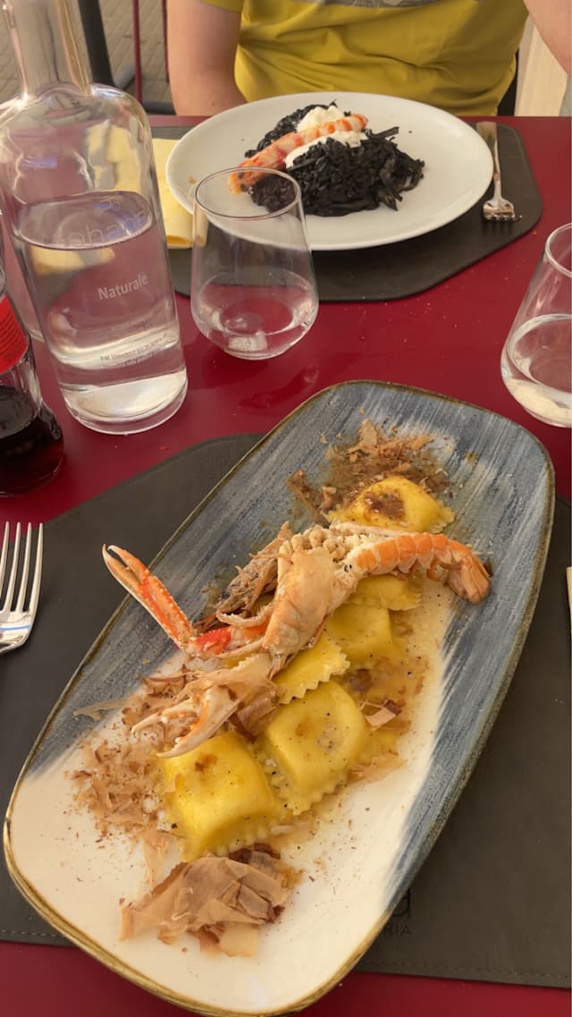 Ravioli con burrata mantecati al burro, con tartare di scampi, zeste di limone e katsuobushi