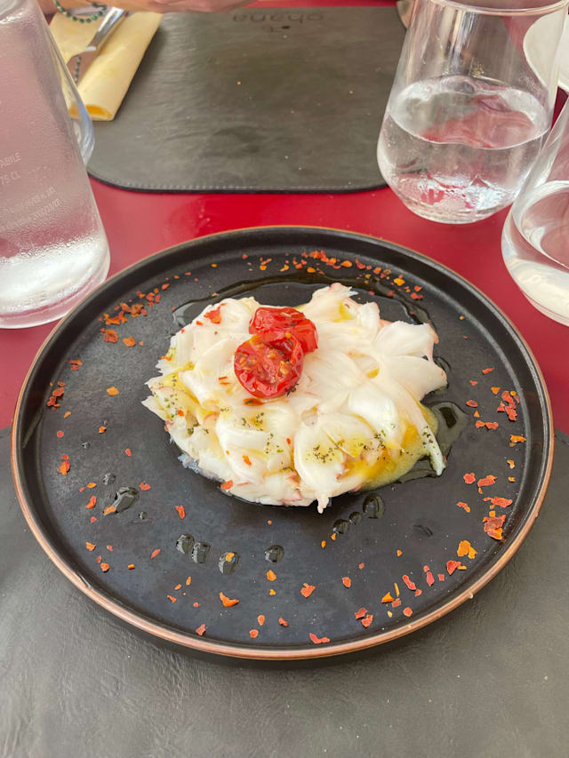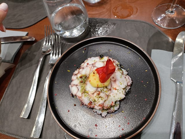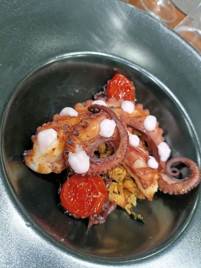 Polpo scottato su crumble di pane, cipolla caramellata, pomodorini confit, capperi e maionese di polpo
