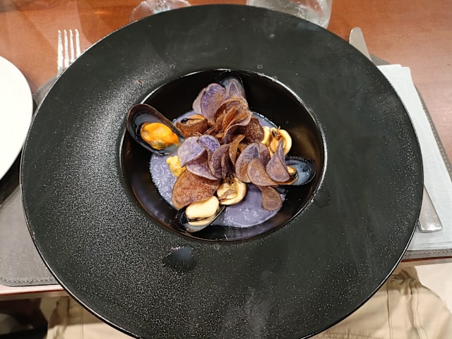 Patate & cozze 2.0 servite su vellutata di patate viola con chips di patate viola