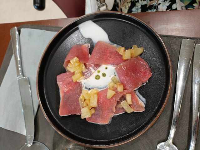 Sashimi di tonno servito su colatura di mozzarella e brunoise di pesche
