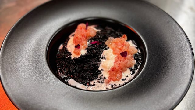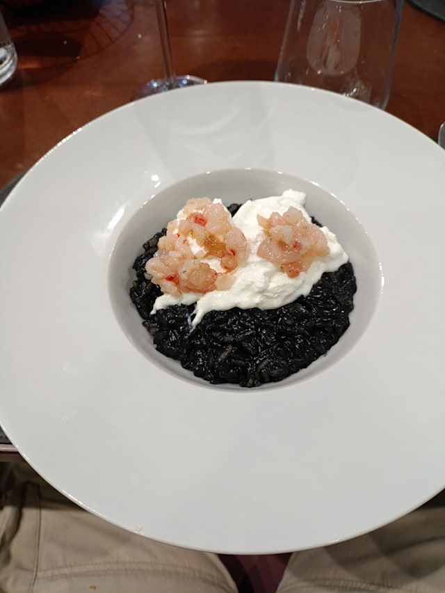 Perle di riso al nero di seppia, burro di gamberi con stracciatella e quenelle di gambero rosso