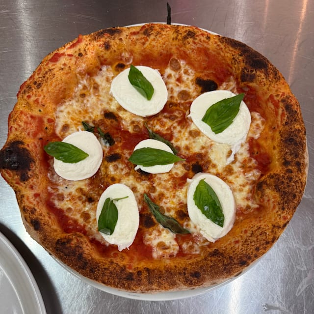 - Sauce tomate, mozzarella, mozzarella de bufala et basilic