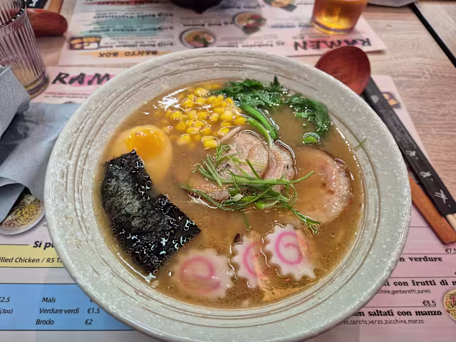 - Ramen in brodo di maiale chasu, con pancetta brasata, mais, uova marinato, naruto, erba cipollina, verdure, foglia alga, verdure verdi