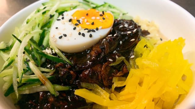 Spaghetti coreani con salsa nera di fagiolo, cipolla, uova, cetrioli, sesamo