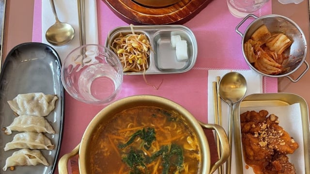 Zuppa di cavolo fermentato in una salsa a base di peperoncino con pancetta e tofu
