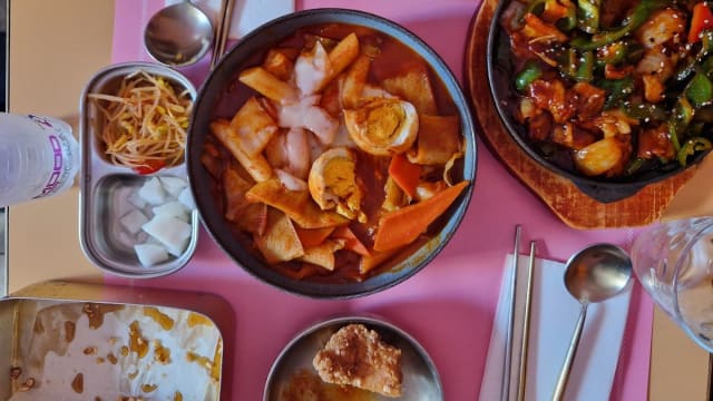 Gnocchi di riso coreani e spaghetti in salsa piccante con uovo sodo, pastella di pesce e verdure