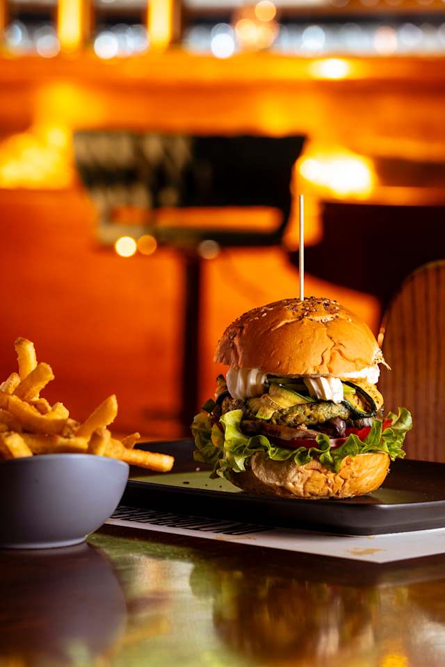 - Pane bun ai cereali, burger di avena e verdure, lattuga iceberg, pomodorini semi-dry