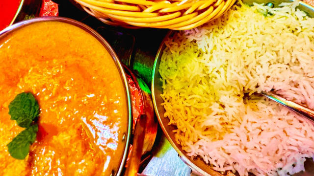 - Arroz basmati frito, vegetais, camarão, cabrito e frango e especiarias