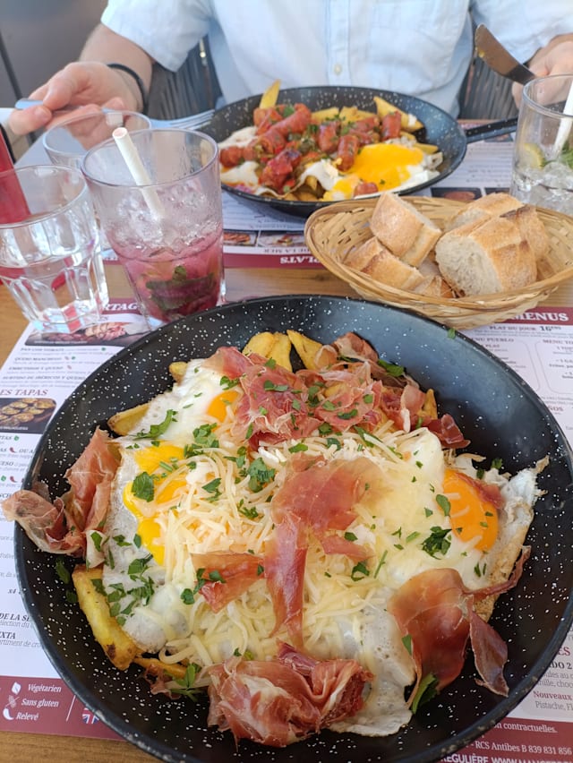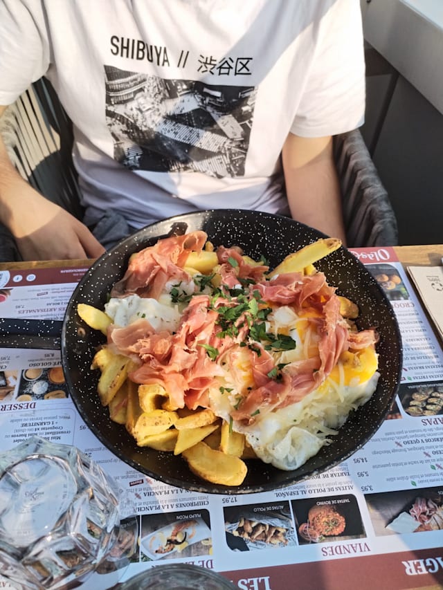 6.5/10Good fast lunch Eggs with Parma ham and chips in a skillet