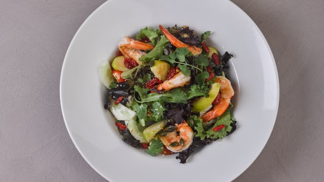 Fried prawns with olive oil, garlic and bay leaf, refreshed with brandy and white wine, with sweet chilli sauce and coriander leaves