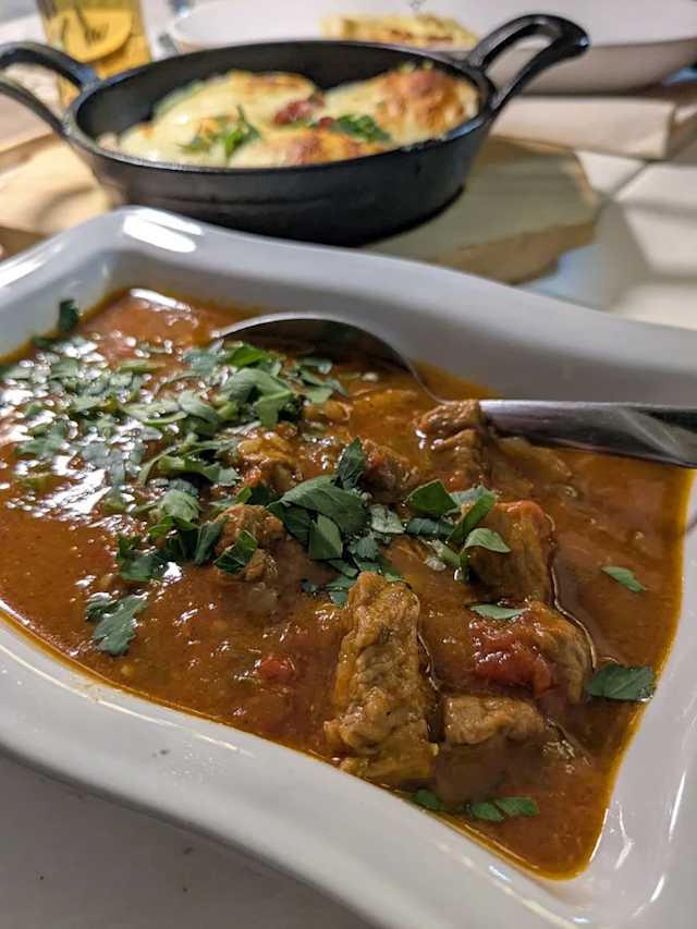 - Spezzatino di manzo con sugo di pomodoro (carne di manzo, aglio, cipolla, prezzemolo, coriandolo, pomodoro, spezie, sale)