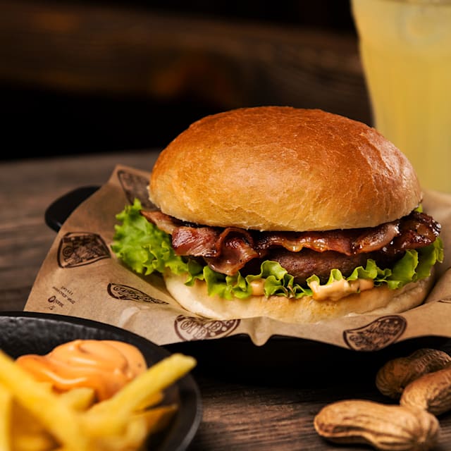 Panino con semi di sesamo*, hamburger*, formaggio fuso, bacon, onion relish, pomodoro, insalata iceberg e salsa barbecue, servito con patate* fries e salsa oww