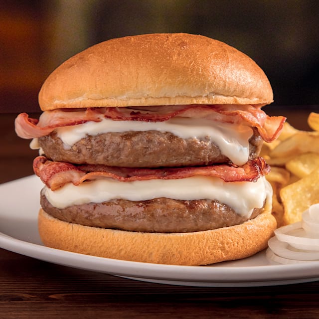 Panino*, hamburger*, bacon, formaggio cheddar, formaggio fuso, onion rings*, insalata iceberg e salsa barbecue, servito con patate* fries e salsa barbecue