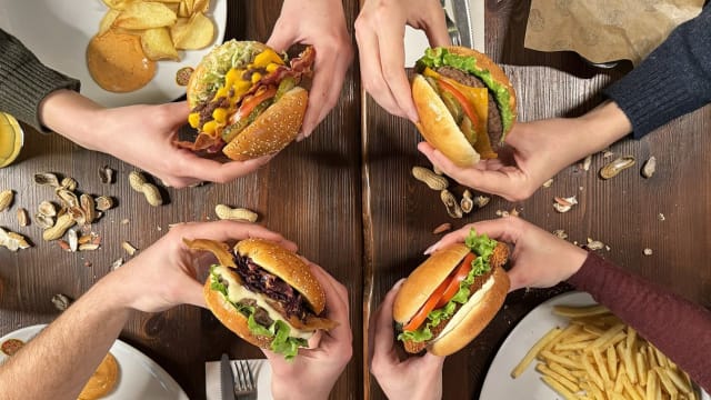 Panino*, hamburger*, formaggio cheddar, bacon, insalata e salsa barbecue.