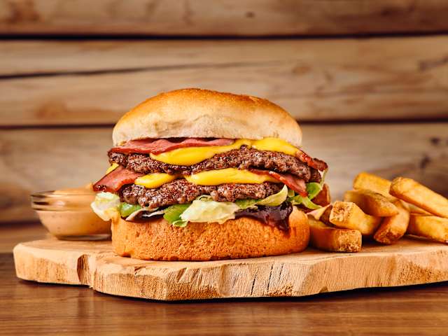 - Steak haché au couteau 180g, galette de pommes de terre, mayonnaise aux champignons, cantal AOP, bacon, œuf au plat, garden salade. Toutes nos viandes sont servies avec nos frites croustillantes et notre sauce signature old wild west