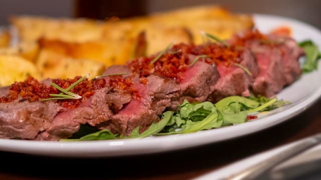 Tagliata di manzo alla griglia, servita su letto di spinacino, accompagnata da salsa oww e patate al forno (bibita 0,3 l o acqua 0,5 l inclusa)