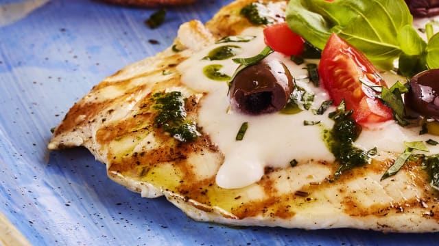 Petto di pollo italiano alla griglia, fonduta di scamorza, pomodorini datterino, olive taggiasche, salsa verde e basilico accompagnato da patate al forno (bibita 0,3 l o acqua 0,5 l inclusa)