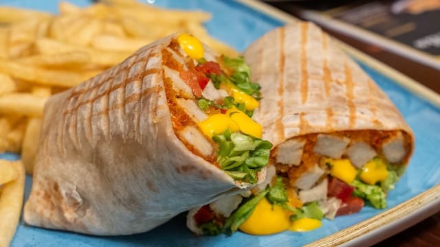 Tortilla di grano farcita con cotoletta di pollo* panata, crema di pomodori secchi, scaglie di parmigiano reggiano DOP, insalata e salsa OWW.
