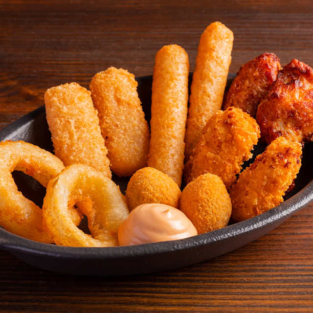 - 2 Onion rings, 2 chicken nuggets, 2 chicken wings, 2 mozzarella sticks, 6 potato crunchies, serviti con salsa oww
