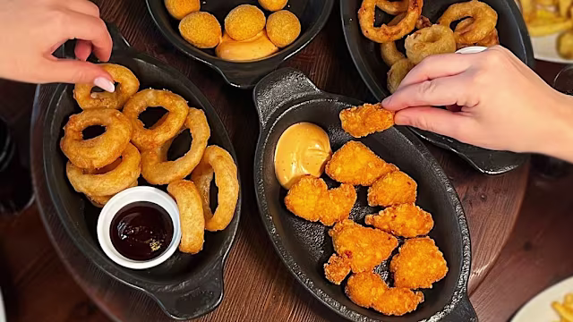 - 2 onion rings*, 2 chicken nuggets*, 2 chicken wings*, 2 mozzarella sticks*, 2 green balls*, 2 cheesy sticks*, serviti con salsa OWW.