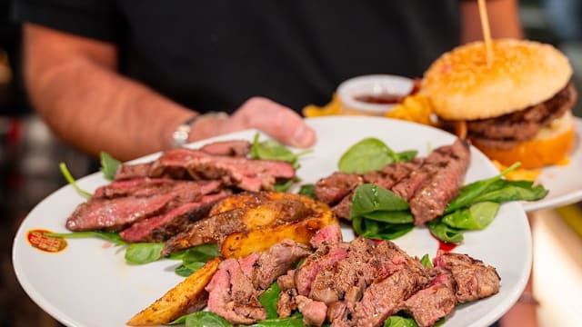 - Tagliata di manzo alla griglia, servita su letto di spinacino, accompagnata da salsa OWW e patate al forno (bibita 0,3 l o acqua 0,5 l inclusa)