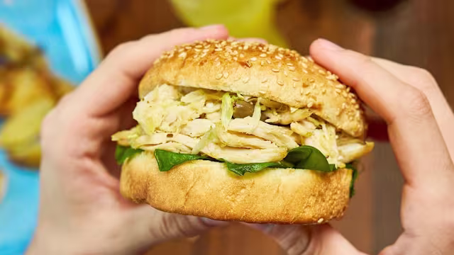 - Panino con semi di sesamo*, petto di pollo* italiano sfilacciato, condito con salsa alla senape, spinacino, maionese senapata, olive taggiasche, parmigiano reggiano DOP e insalata iceberg, servito con salsa OWW e patate* fries (bibita 0,3 l o acqua 0,5 l inclusa)