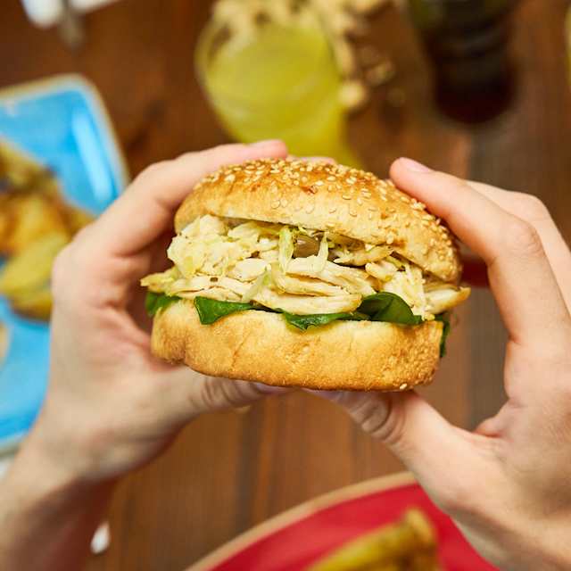 - Panino con semi di sesamo, petto di pollo italiano sfilacciato, condito con salsa alla senape, spinacino, maionese senapata, olive taggiasche, parmigiano reggiano dop e insalata iceberg, servito con salsa oww e patate fries. Compresa nel prezzo una bibita tra: - coca-cola alla spina da 0,3 l/ coca-cola zero zuccheri alla spina da 0,3 l/ fanta orange alla spina da 0,3 l/ acqua minerale da 0,5 l