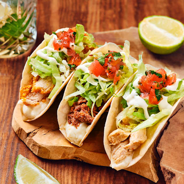 - Assortiment de trois tasty tacos: crispy chicken, chicken & beef