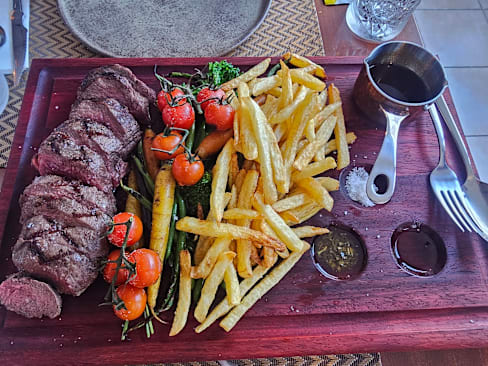 10/10Attentive prompt and friendly service. Great food. Had the bom bom shared platter with rump steak, a variety of char grilled vegetables, sauces and fries, lovely flavours. Desserts also lovely, lemon meringue cheesecake and apple crumble with ice-cream.