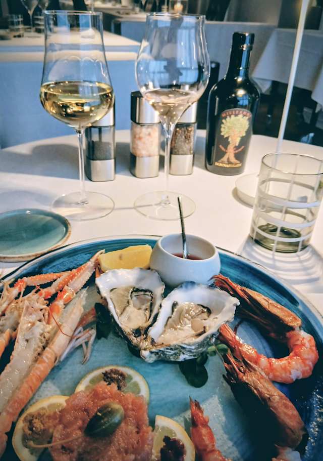 - 1 gambero rosso di Mazara del Vallo, 1 scampo Sicilia, 1 ostrica Gillardeau, tartare di tonno rosso, tartare di salmone, capasanta sfilettata
