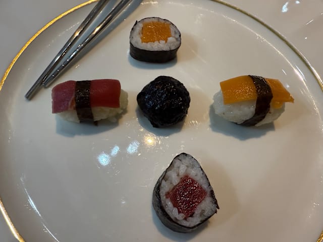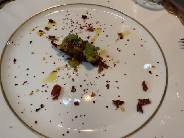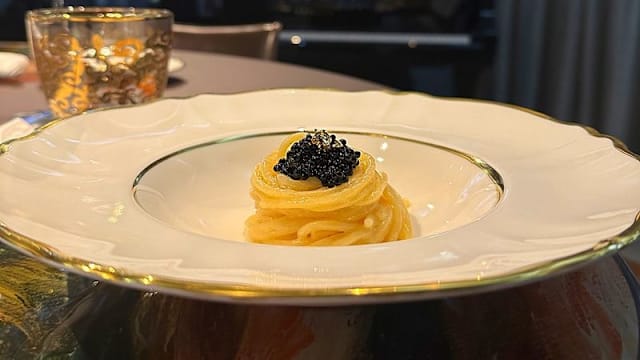 Caviale su pannacotta di cavolfiore hummus con cipolla caramellata wafer con seppia ai frutti di bosco