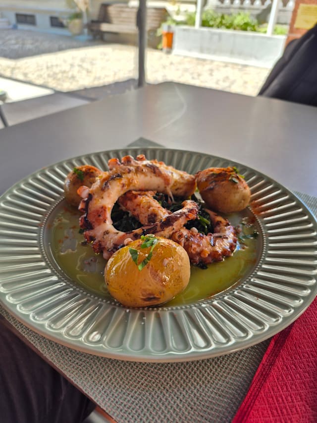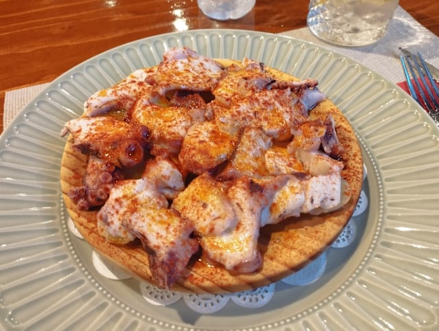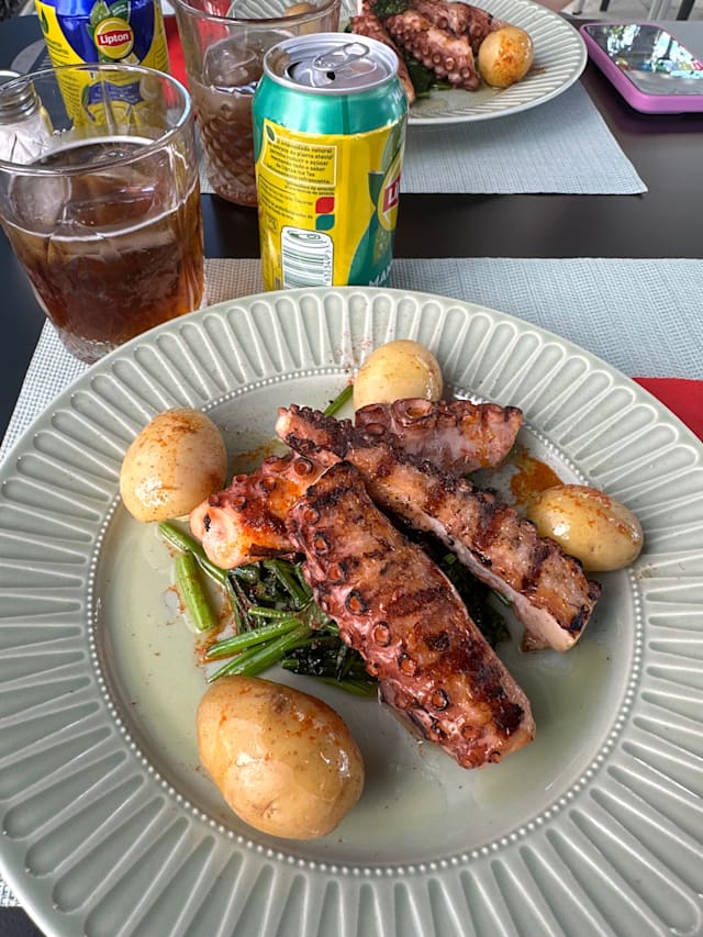 Polvo, mistura de pimentos, cebola, vinagre, azeitonas e coentros