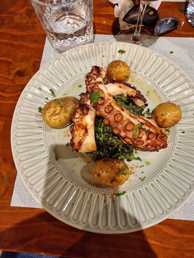 - Polvo, mistura de pimentos, cebola, vinagre, azeitonas e coentros