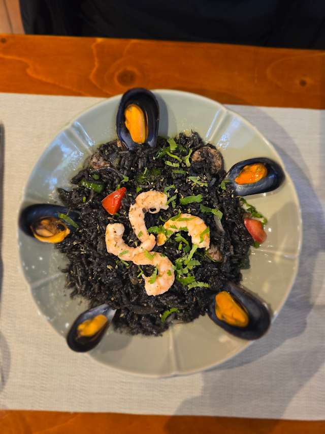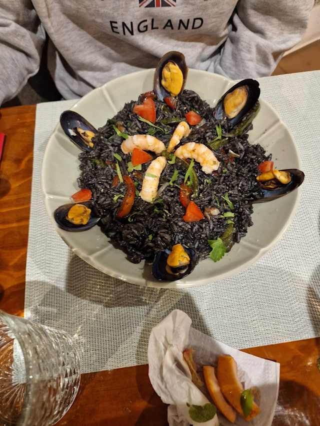 - Arroz preto, gambas, mexilhões, cebulardo e pimentos