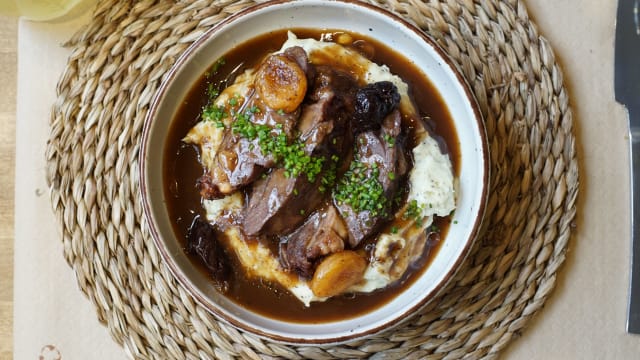 Cocidas a baja temperatura con salsa de vermouth espinaler, parmentier de patatas trufadas ciruleas y orejones, acabado con un aceite de trufa