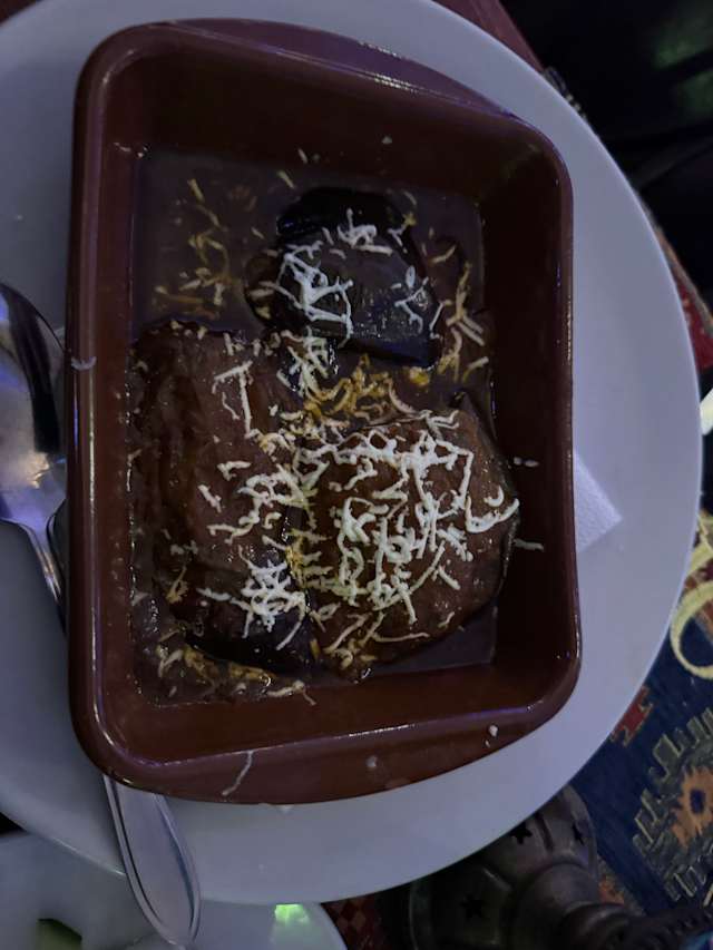 - mals lamsvlees, klaargemaakt in een overheerlijke pikante tomatenwijnsaus, geserveerd aubergine uit eigen keuken, gegratineerd met feta, rijst, frites en salade