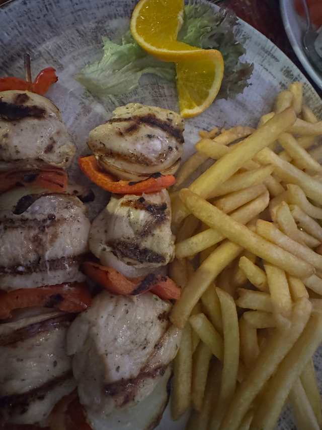 - kipfilet aan spies, paprika, uien, met tzatziki, frites, rijst en salade
