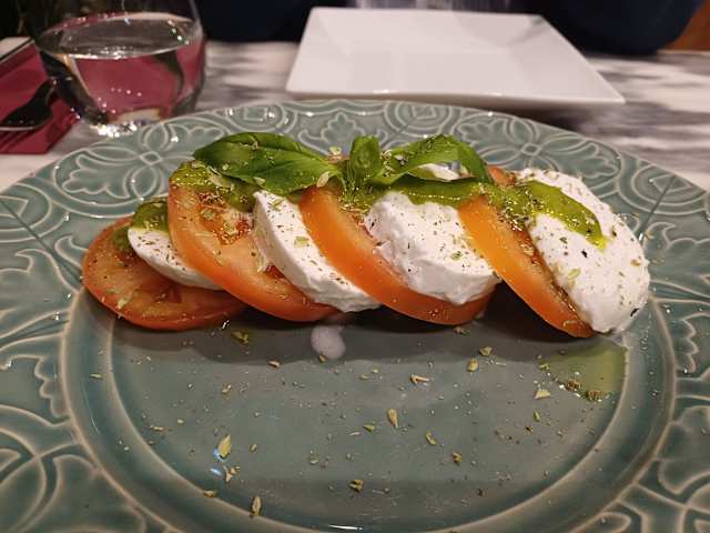 - Tomate, mozzarella di bufala, tomate cherry, manjericão, pesto e orégãos