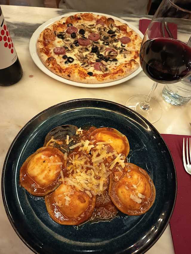 - Tomate, mozzarella, fiambre, cogumelos, chouriço picante, azeitonas e oregãos
