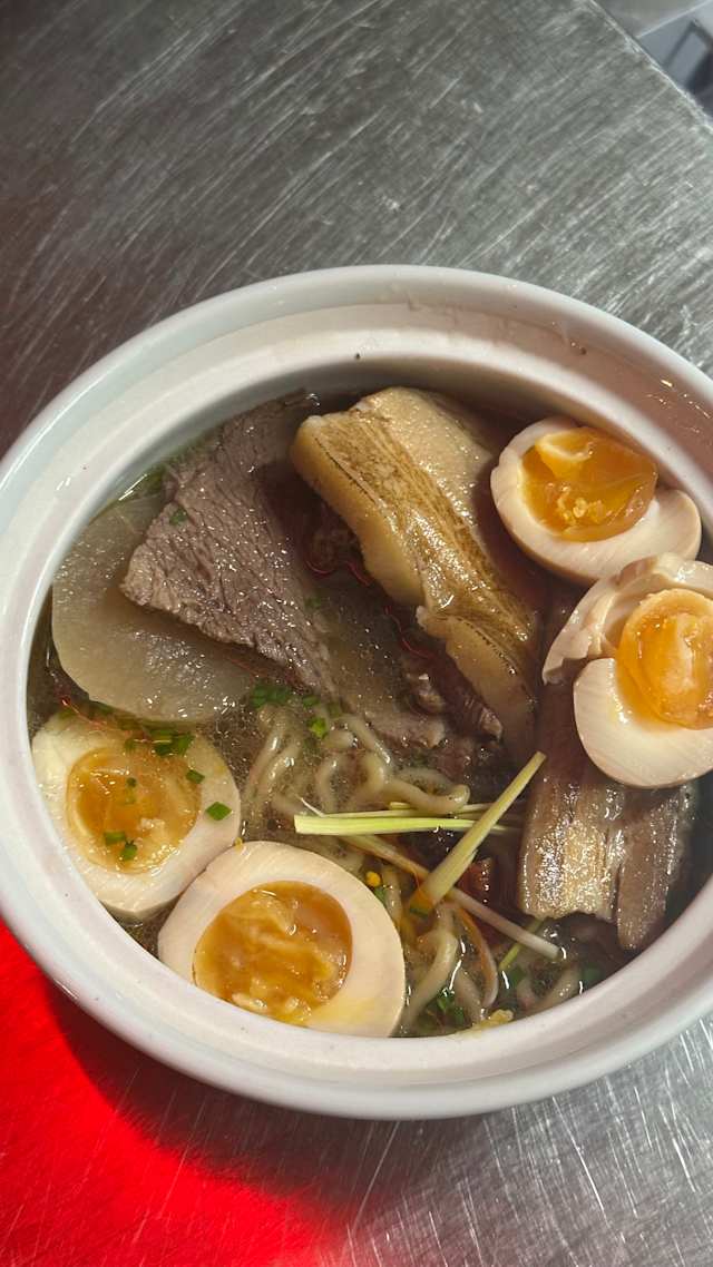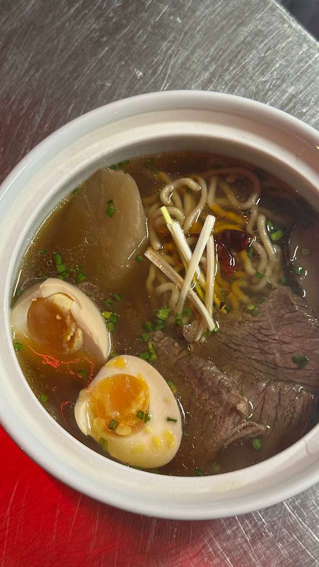 - A bowl of noodles, reindeer broth, shoyu with Kuro shoyu (black garlic), daikon radish with tender reindeer pieces and a marinated egg