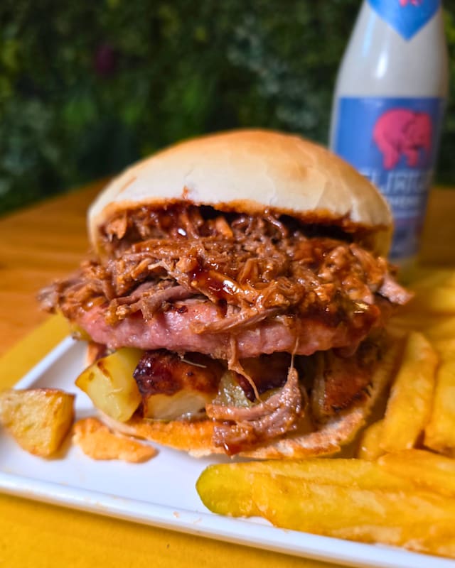 - Bun, pulled pork, patate al forno, insalata, mayo al rosmarino