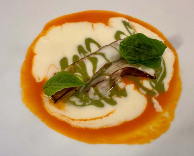 - Parmigiana scomposta con spuma al grana dressing al basilico