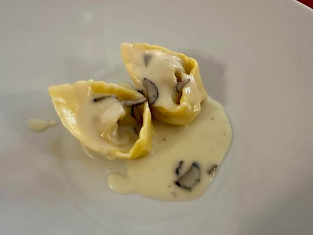 - Raviolo al baccalà mantecato zafferano e balsamico