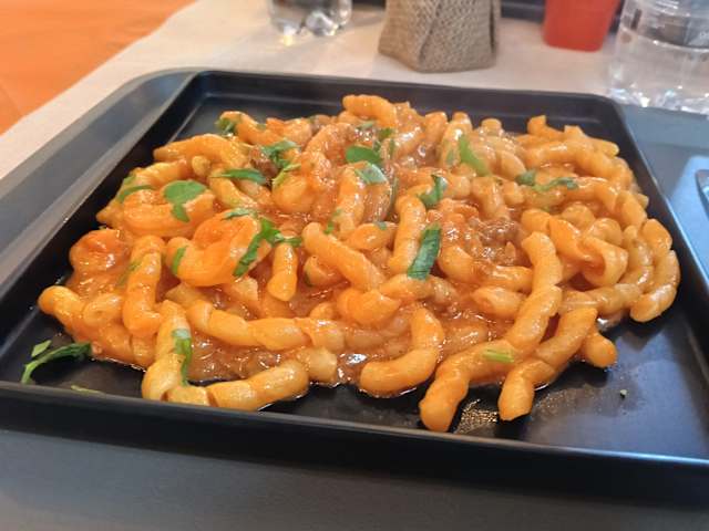 - Casarecce di pasta fresca al Ragu di carne con Gamberetti e Melanzane Fritte, olio e prezzemolo