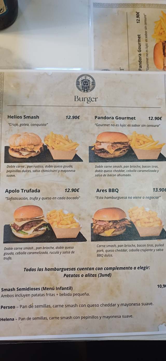 - Ambos incluyen patatas fritas + bebida pequeña. Perseo - pan de semillas, carne smash con queso cheddar y mayonesa suave. Helena - pan de semillas, carne smash con pepinillos y mayonesa suave.